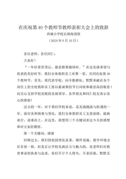 / 时令材料∣0910教师节:20240910在庆祝第40个教师节教师表彰大会上的致辞——西城小学校长杨海清致