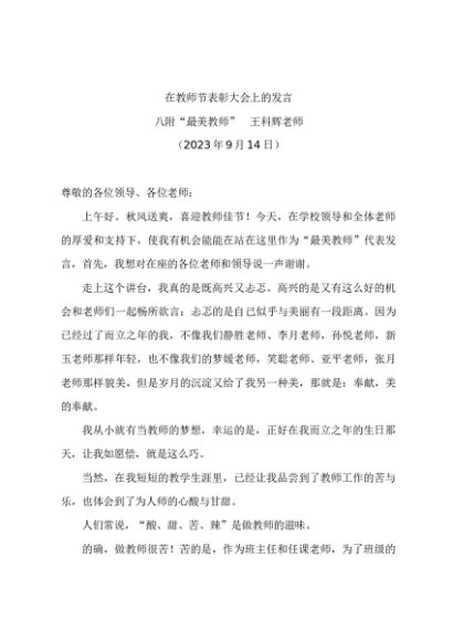 / 时令材料∣0910教师节:20230914在教师节表彰大会上的发言——最美教师代表王科辉老师