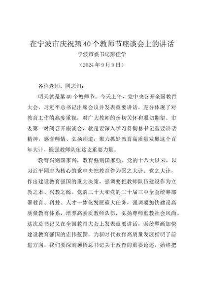 / 时令材料∣0910教师节:20240910在宁波市庆祝第40个教师节座谈会上的讲话——宁波市委书记彭佳学