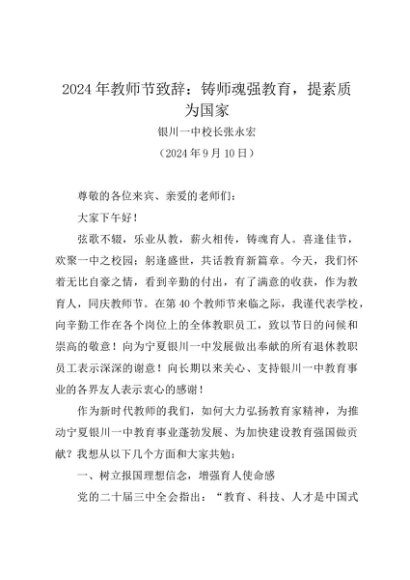 / 时令材料∣0910教师节:202409102024年教师节致辞:铸师魂强教育,提素质为国家——银川一中校长