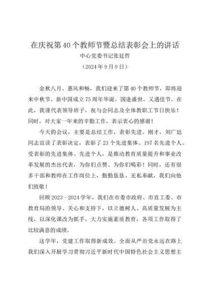 / 时令材料∣0910教师节:20240910在庆祝第40个教师节暨总结表彰会上的讲话——中心党委书记张廷哲