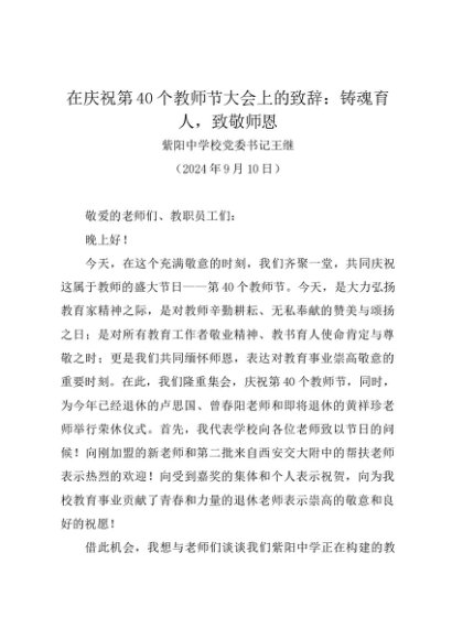 / 时令材料∣0910教师节:20240910在庆祝第40个教师节大会上的致辞:铸魂育人,致敬师恩——紫阳中学校党委书记王继