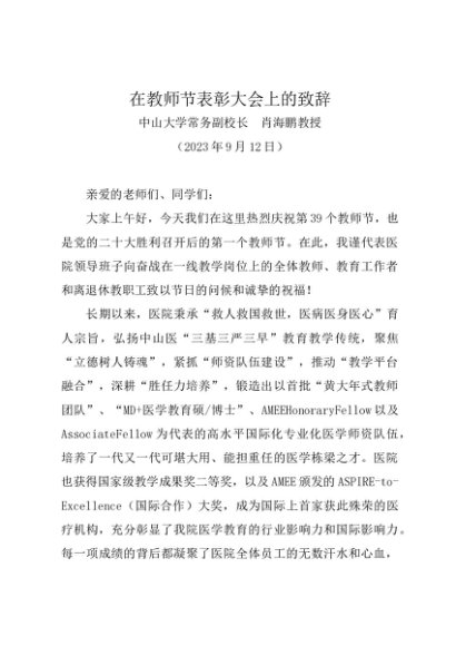时令材料∣0910教师节:20230912在中山大学教师节表彰大会上的致辞——副校长 肖海鹏