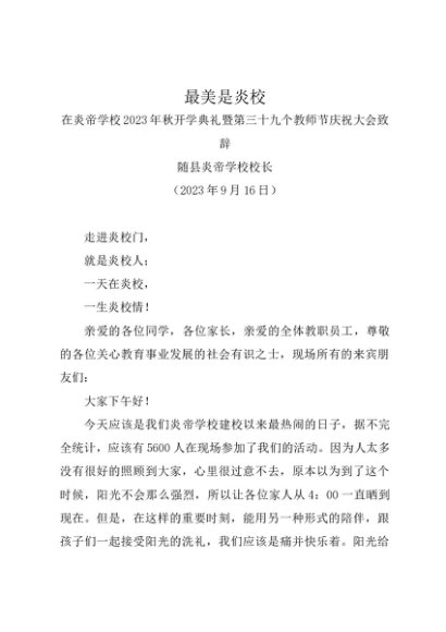 / 时令材料∣0910教师节:20230916在炎帝学校2023年秋开学典礼暨第三十九个教师节庆祝大会致辞——校长