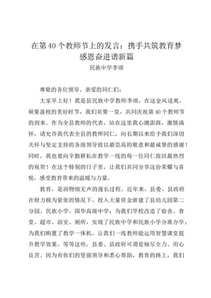 / 时令材料∣0910教师节:20240910在第40个教师节上的发言:携手共筑教育梦 感恩奋进谱新篇——民族中学李颂