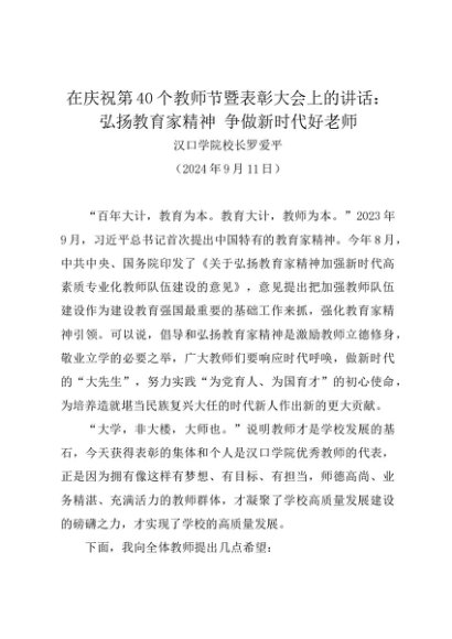 时令材料∣0910教师节:20240910在庆祝第40个教师节暨表彰大会上的讲话:弘扬教育家精神 争做新时代好老师——汉口学院校长