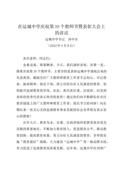 时令材料∣0910教师节:20230908在运城中学庆祝第39个教师节暨表彰大会上的讲话——书记 孙中全