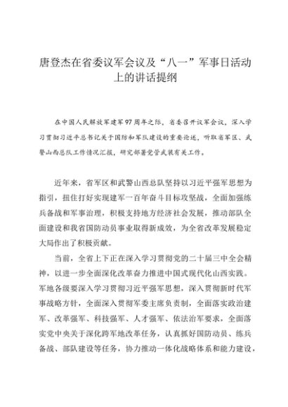 / 时令材料∣0801建军节:20240801唐登杰在省委议军会议及“八一”军事日活动上的讲话提纲