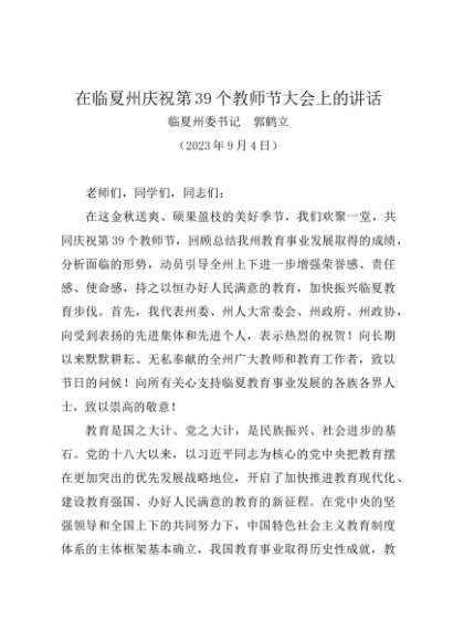 / 时令材料∣0910教师节:20230904在临夏州庆祝第39个教师节大会上的讲话——临夏州委书记 郭鹤立(1)