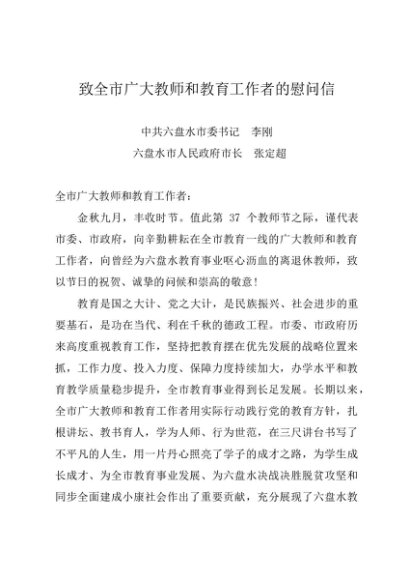/ 时令材料∣0910教师节:20210910致全市广大教师和教育工作者的慰问信——六盘水市委市政府