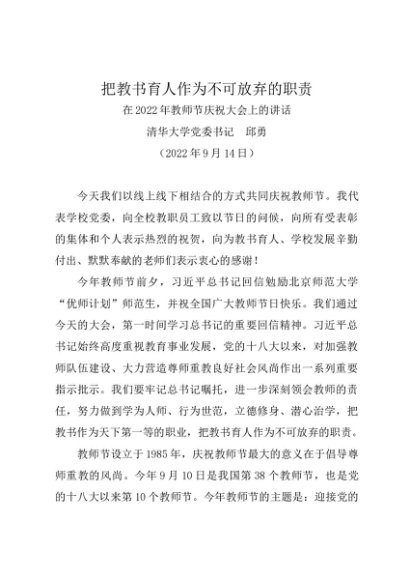 / 时令材料∣0910教师节:20220914在2022年教师节庆祝大会上的讲话——清华大学党委书记 邱勇