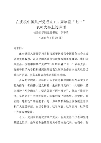 时令材料∣0701建党节:20230630在庆祝中国共产党成立102周年暨“七一”表彰大会上的讲话——长治医学院党委书记 李华荣
