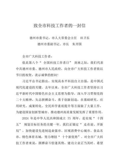 时令材料∣0530科技工作者日:20240530致全市科技工作者的一封信——德州市