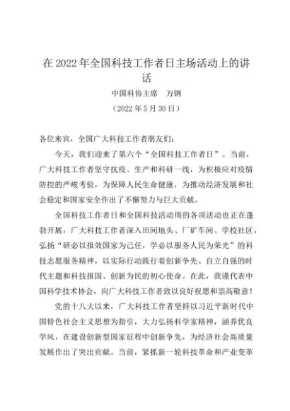 / 时令材料∣0530科技工作者日:20220530在全国科技工作者日主场活动上的讲话——中国科协主席 万钢