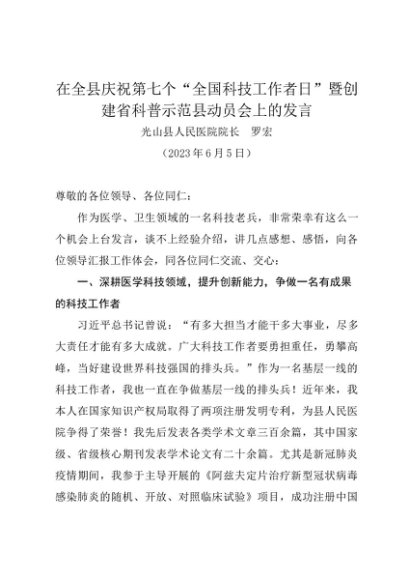 时令材料∣0530科技工作者日:20230605在全县庆祝第七个“全国科技工作者日”暨创建省科普示范县动员会上的发言——医院院长 罗宏