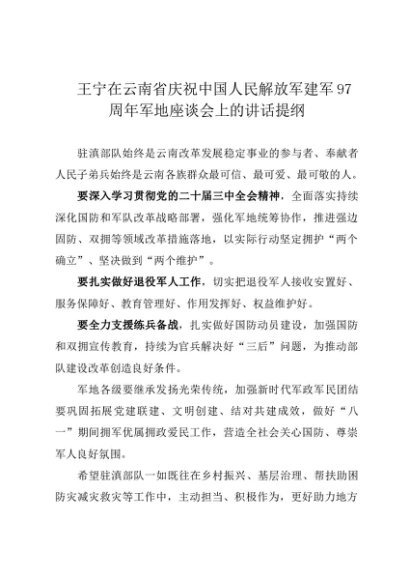 / 时令材料∣0801建军节:20240731王宁在云南省庆祝中国人民解放军建军97周年军地座谈会上的讲话提纲