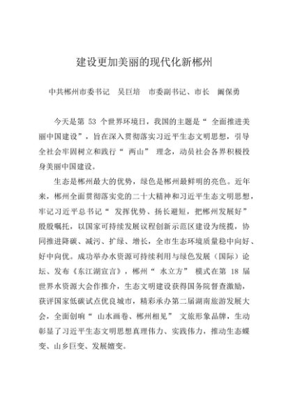 时令材料∣0605环境日:20240605建设更加美丽的现代化新郴州——中共郴州市委书记 吴巨培 市委副书记、市长 阚保勇