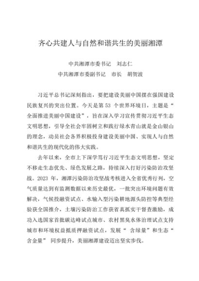 / 时令材料∣0605环境日:20240605齐心共建人与自然和谐共生的美丽湘潭——中共湘潭市委书记