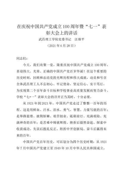 时令材料∣0701建党节:20210628在庆祝中国共产党成立100周年暨“七一”表彰大会上的讲话——武昌理工学院党委书记 汪继平