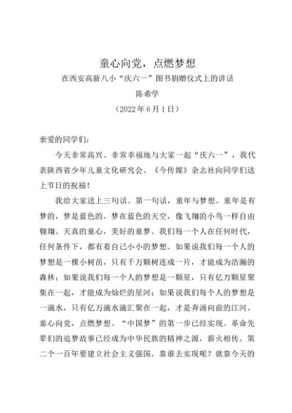 时令材料∣0601儿童节:20220601在西安高新八小“庆六一”图书捐赠仪式上的讲话——陈希学