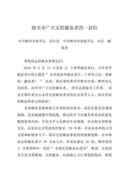 时令材料∣0614献血者日:20240614致全市广大无偿献血者的一封信——中共郴州市委书记