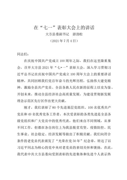 时令材料∣0701建党节:20210704在“七一”表彰大会上的讲话(七一党课)——大方县委副书记 游劲松