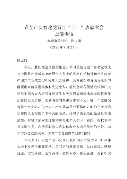 / 时令材料∣0701建党节:20210702在全市庆祝建党百年“七一”表彰大会上的讲话——安顺市委书记 陈少荣