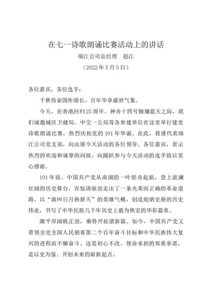 / 时令材料∣0701建党节:20220705在七一诗歌朗诵比赛活动上的讲话——瑞江公司总经理 赵江