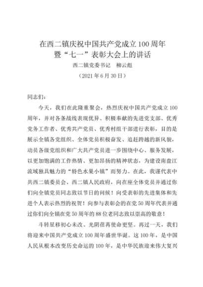 时令材料∣0701建党节:20210630在庆祝中国共产党成立100周年暨“七一”表彰大会上的讲话——西二镇党委书记 柳云彪