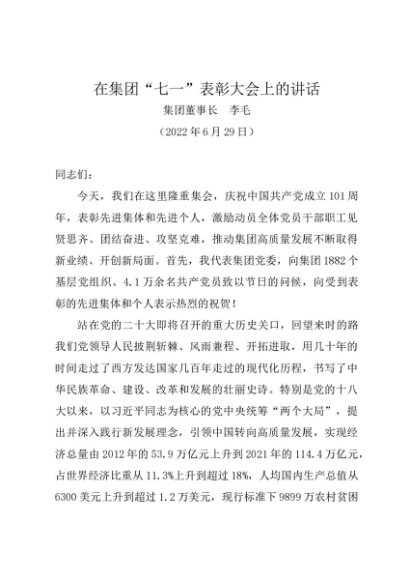 / 时令材料∣0701建党节:20220629在“七一”表彰大会上的讲话——集团董事长 李毛