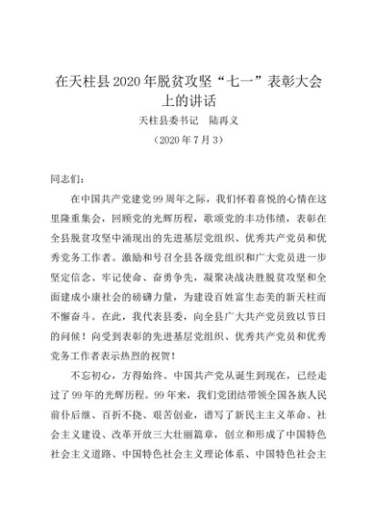 / 时令材料∣0701建党节:20200703在天柱县2020年脱贫攻坚“七一”表彰大会上的讲话——天柱县委书记 陆再义