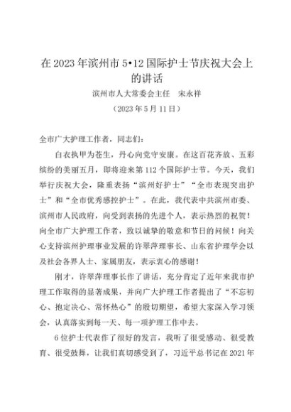 / 时令材料∣0512护士节:20230511在5•12国际护士节庆祝大会上的讲话——滨州市人大主任 宋永祥