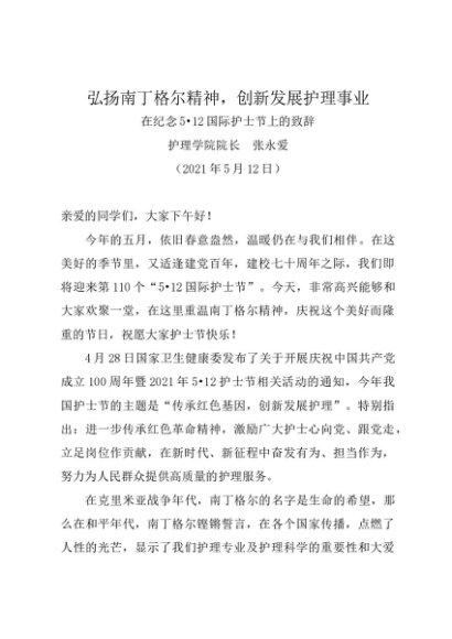 时令材料∣0512护士节:20210512在纪念5•12国际护士节上的致辞——护理学院院长 张永爱