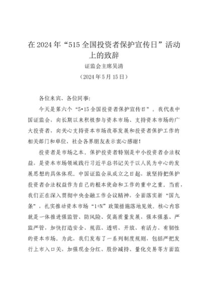 时令材料∣0515投资者保护宣传日:20240515在2024年“515全国投资者保护宣传日”活动上的致辞——证监会主席吴清