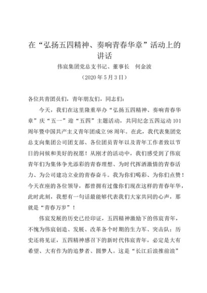 / 时令材料∣0504青年节:20200503在“弘扬五四精神、奏响青春华章”活动上的讲话——伟宸集团党总支书记 何金波
