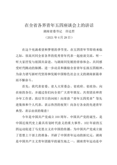 时令材料∣0504青年节:20210428在全省各界青年五四座谈会上的讲话——湖南省委书记 许达哲