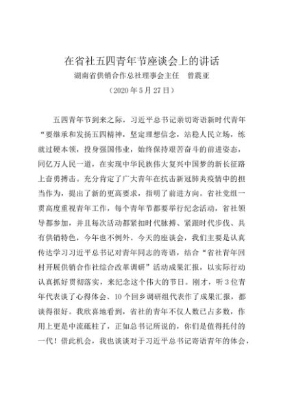 时令材料∣0504青年节:20200527在五四青年节座谈会上的讲话——湖南省供销合作总社 曾震亚