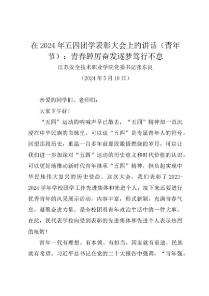 时令材料∣0504青年节:20240510在2024年五四团学表彰大会上的讲话(青年节):青春踔厉奋发逐梦笃行不怠——江苏安全技术职业学院党委书记张东良