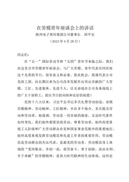 / 时令材料∣0501劳动节:20230428在劳模青年座谈会上的讲话——陕西电子黄河集团公司董事长 邱平乐