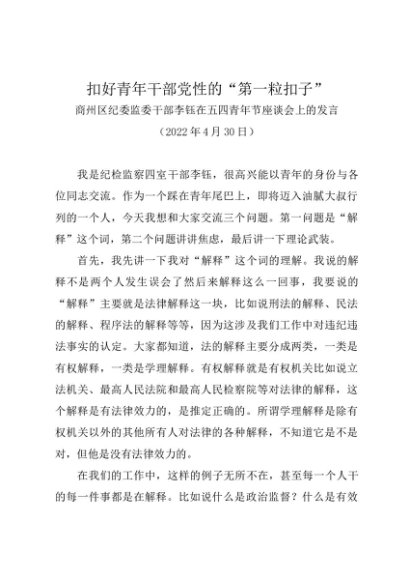 时令材料∣0504青年节:20220430扣好青年干部党性的“第一粒扣子”——商州区纪委监委干部李钰在五四青年节座谈会上的发言
