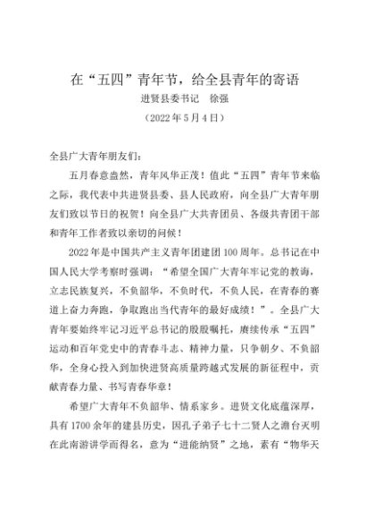 / 时令材料∣0504青年节:20220504在“五四”青年节,给全县青年的寄语——进贤县委书记 徐强