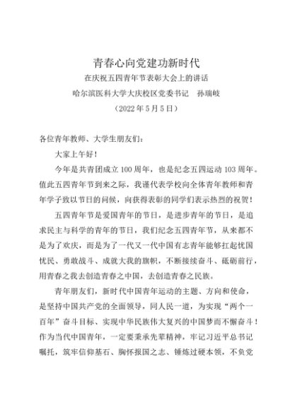 / 时令材料∣0504青年节:20220505在庆祝五四青年节表彰大会上的讲话——哈尔滨医科大学党委书记 孙瑞岐