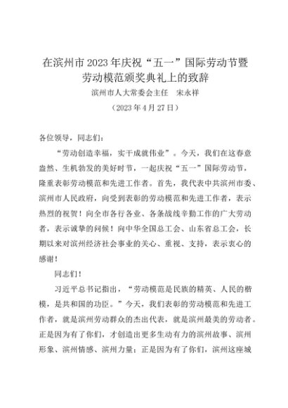 时令材料∣0501劳动节:20230427庆祝“五一”国际劳动节暨劳动模范颁奖典礼上的致辞——滨州市人大常委会主任 宋永祥