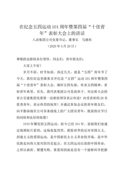 时令材料∣0504青年节:20200429在纪念五四运动101周年暨第四届“十佳青年”表彰大会上的讲话——八冶集团党委书记马德科
