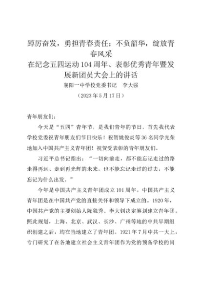 时令材料∣0504青年节:20230517在纪念五四运动104周年、表彰优秀青年暨发展新团员大会上的讲话——襄阳一中学校党委书记 李大强