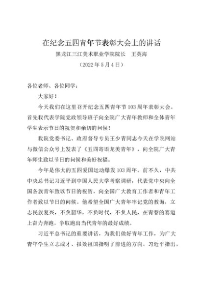 / 时令材料∣0504青年节:20220504在纪念五四青年节表彰大会上的讲话——美术职业学院院长 王英海
