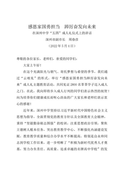 / 时令材料∣0504青年节:20220504在深州中学“五四”成人礼仪式上的讲话——深州市副市长 周春彦
