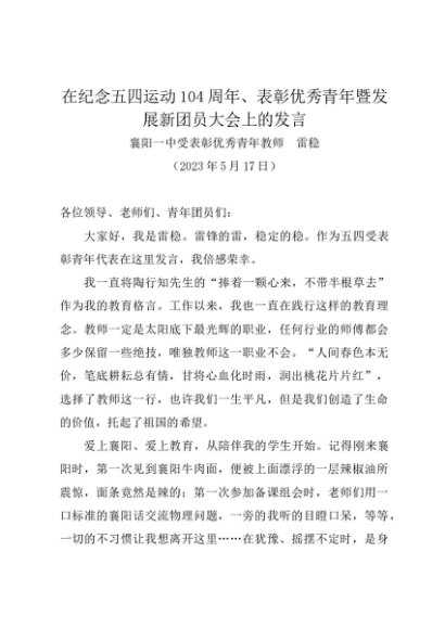 时令材料∣0504青年节:20230517在纪念五四运动104周年、表彰优秀青年暨发展新团员大会上的发言——襄阳一中受表彰教师 雷稳