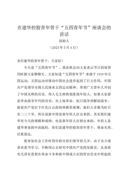 / 时令材料∣0504青年节:20230504在青年骨干“五四青年节”座谈会的讲话——建华控股创始人