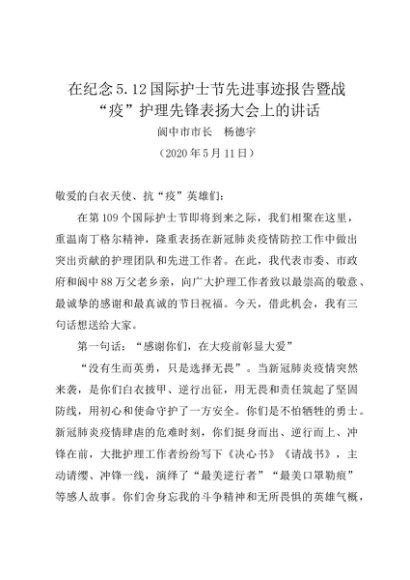 时令材料∣0512护士节:20200512在纪念5.12国际护士节先进事迹报告暨战“疫”护理先锋表扬大会上的讲话——阆中市市长 杨德宇